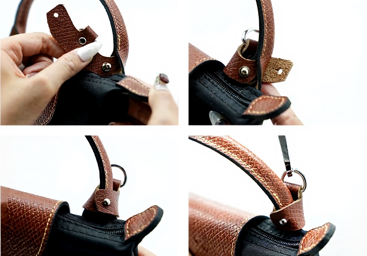 Fixez la boucle en cuir sur la poignée du sac, puis ajoutez les anneaux en D pour terminer l’installation en quelques secondes.