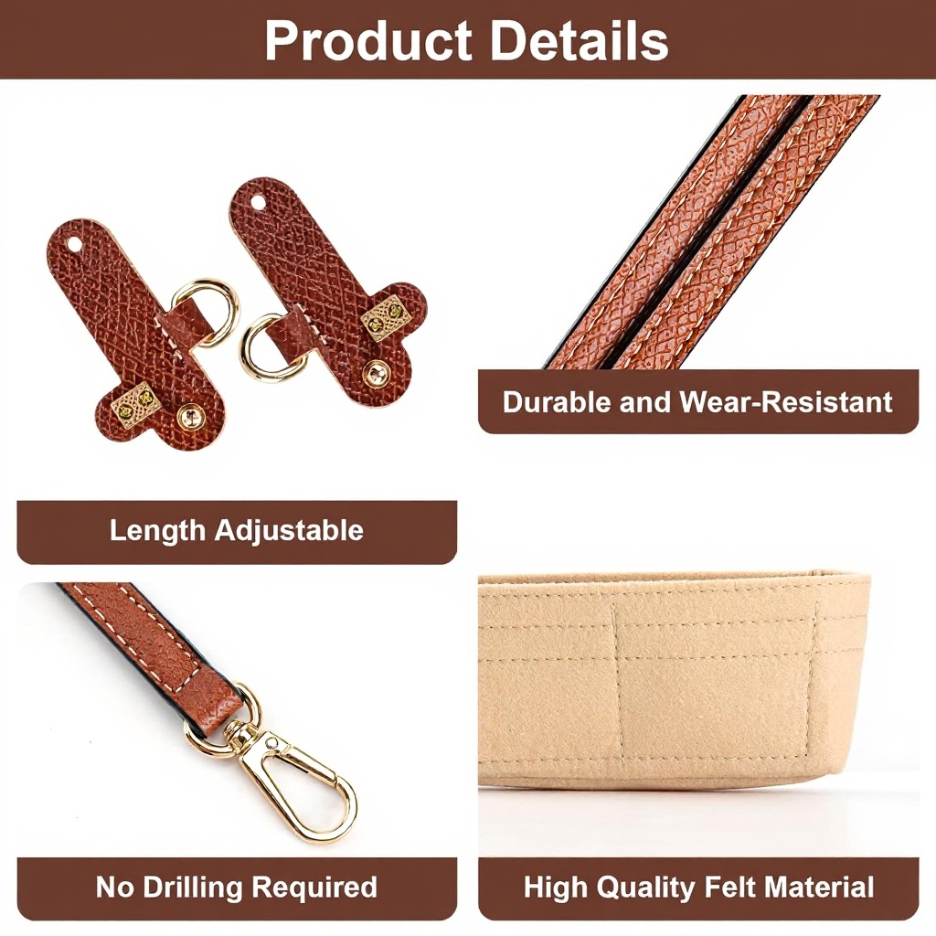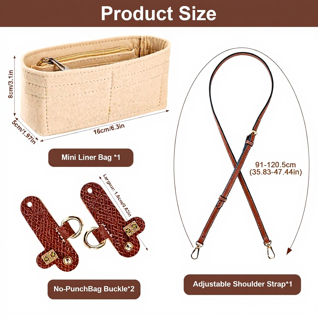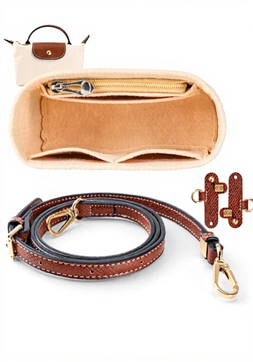 Cet accessoire combine un organisateur en feutre et une bandoulière réglable en cuir, spécialement conçu pour les sacs Longchamp Mini. La bandoulière offre un ajustement personnalisé tandis que l’organisateur maximise l’espace de rangement avec ses poches multiples.