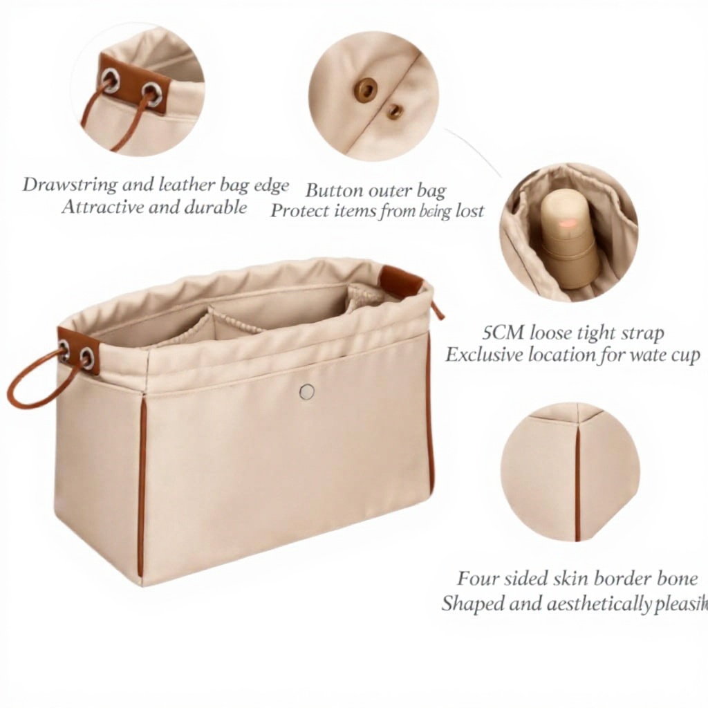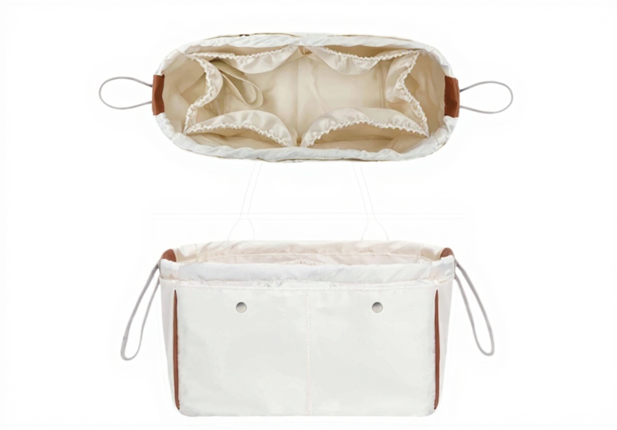 Cet organiseur de sac est conçu en satin épais de haute qualité, offrant une surface lisse, brillante et douce au toucher. Il comprend sept compartiments ainsi qu’une poche dédiée à la tasse, permettant un rangement organisé de vos effets personnels. Un cordon de serrage extérieur assure une sécurité supplémentaire et un ajustement sur mesure.
