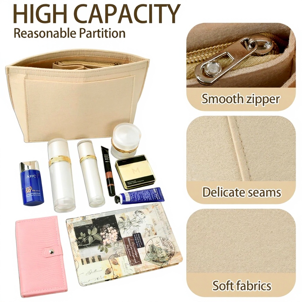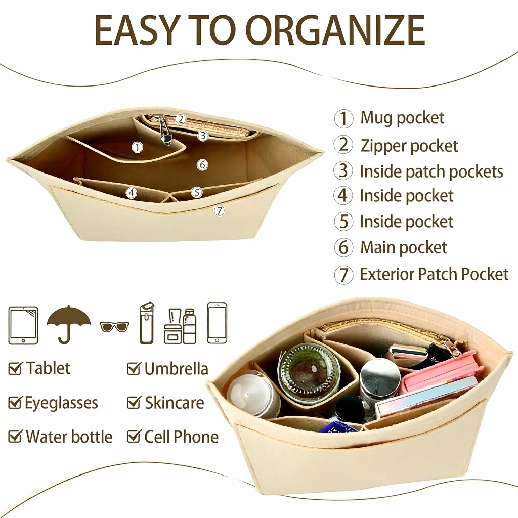 Cet organiseur de sac à main Amexo est conçu en feutre de qualité supérieure, offrant robustesse et durabilité. Son design pliable et ses multiples poches permettent un rangement organisé et sécurisé de vos essentiels, avec une poche zippée pour les objets de valeur.