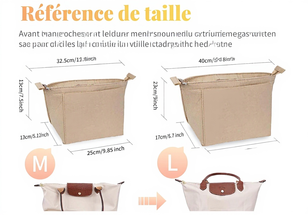 La taille M (32,5x13x19 cm) convient aux sacs Longchamp Le Pliage M, tandis que la taille L (40x17x23 cm) est adaptée aux modèles L. Choisissez selon les dimensions intérieures de votre sac.